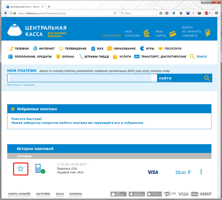 6. Дальше платёж на ООО "Практика" нужно перевести в "Избранные платежи", нажав на звёздочку в строке: